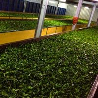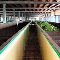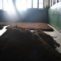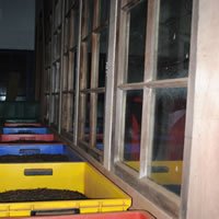 Leaf particles collected from Roll-Breaking are evenly spread in the Fermentation area. Due to oxidization of enzymes in tea leaves, leaf color changes from green to a coppery brown. Temperature of the fermentation area has to be controlled and kept cooler. In average it takes 2 hours for this process to complete, which is decided upon the color & aroma of fermented leaf.